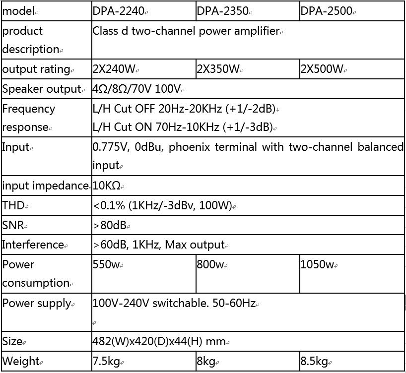 High inverter energy saving switching mode power supply, super performance Class D low power amplifier;1U chassis, 19 inch cabinet space, small consumption, less heat;